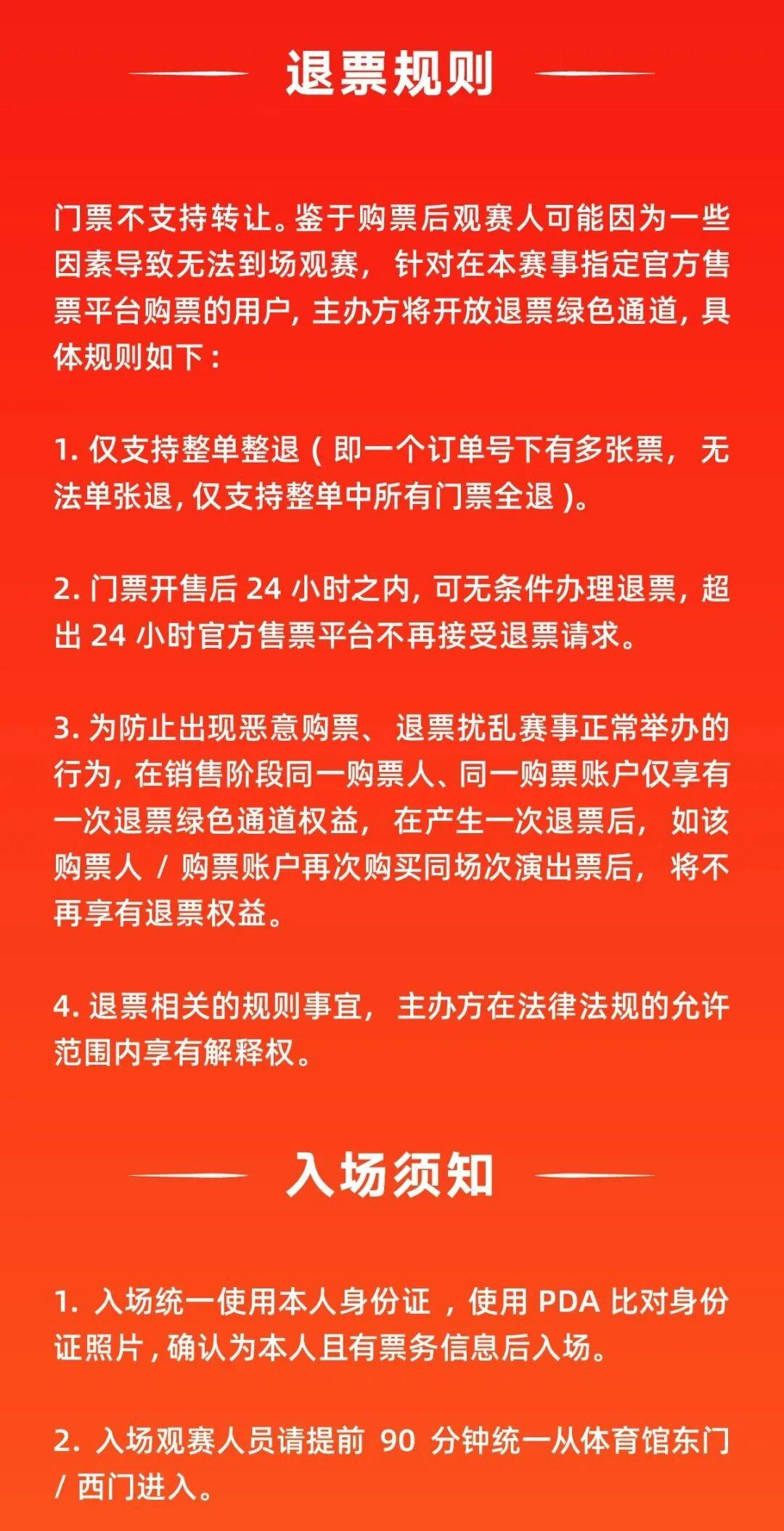 本次赛事采用实名制购票,一票一证,每个用户ID同一场次限购3张。用户购买时需要购票人身份证件信息,每张门票对应一个身份证件号。入场时需提供身份证件原件。
